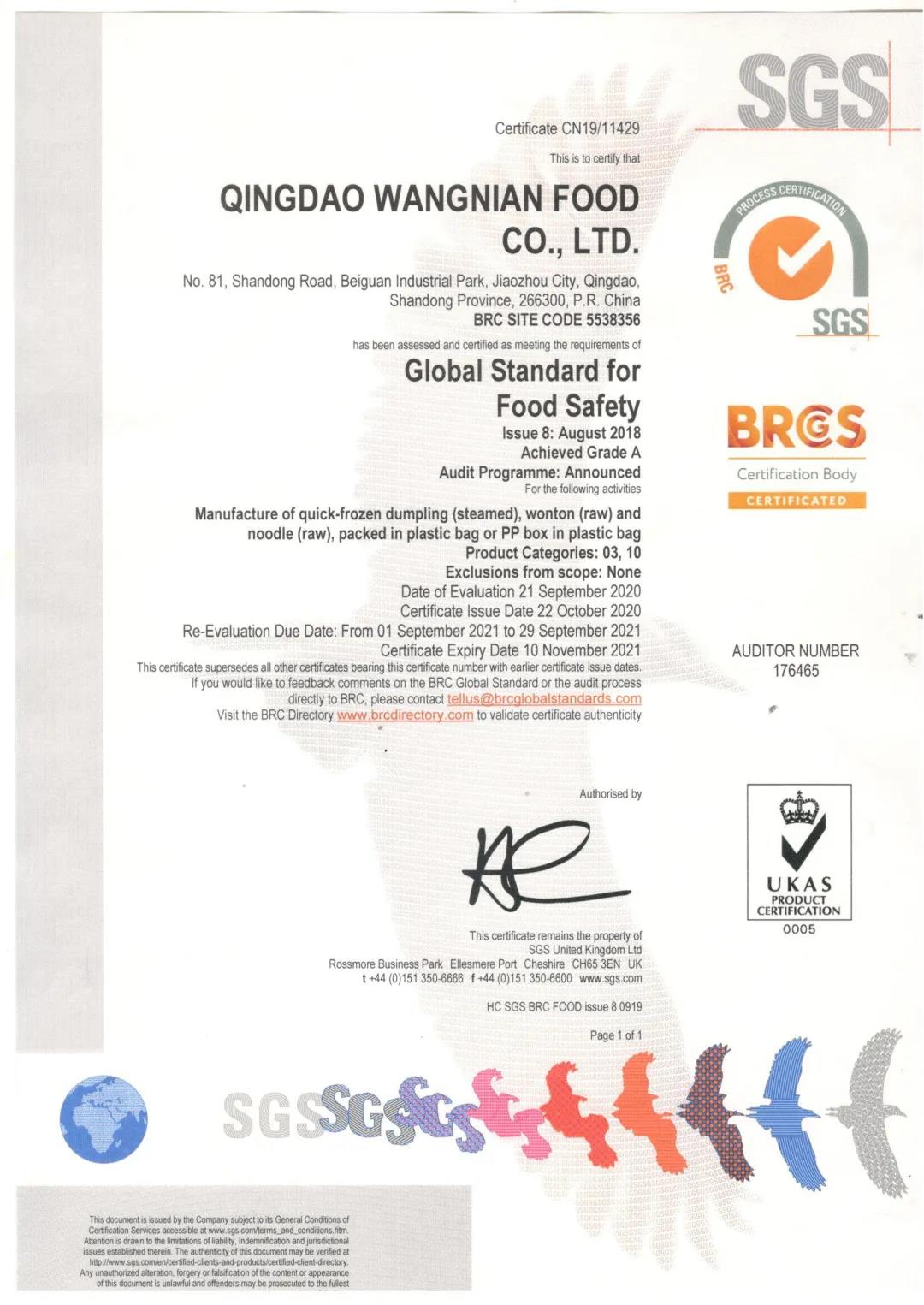 青島旺年食品有限公司榮獲BRC標準A級認證的意義: